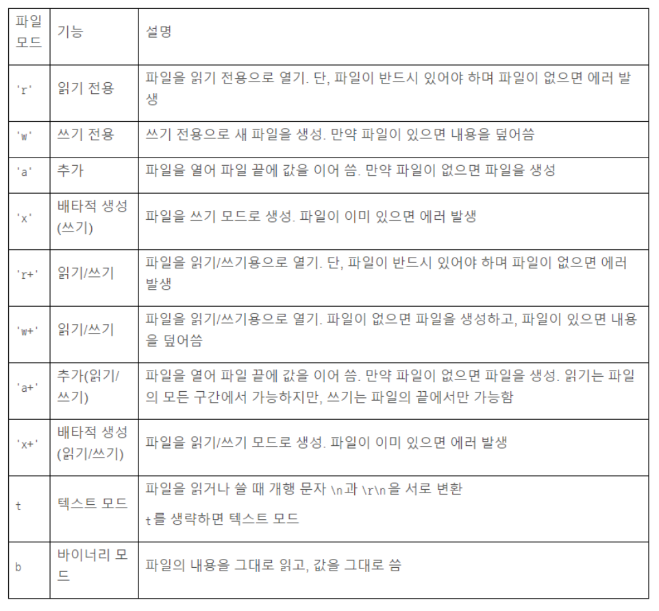 - ํ์ผ ๊ฐ์ฒด=open(ํ์ผ ์ด๋ฆ, ํ์ผ ์ด๊ธฐ๋ชจ๋)
